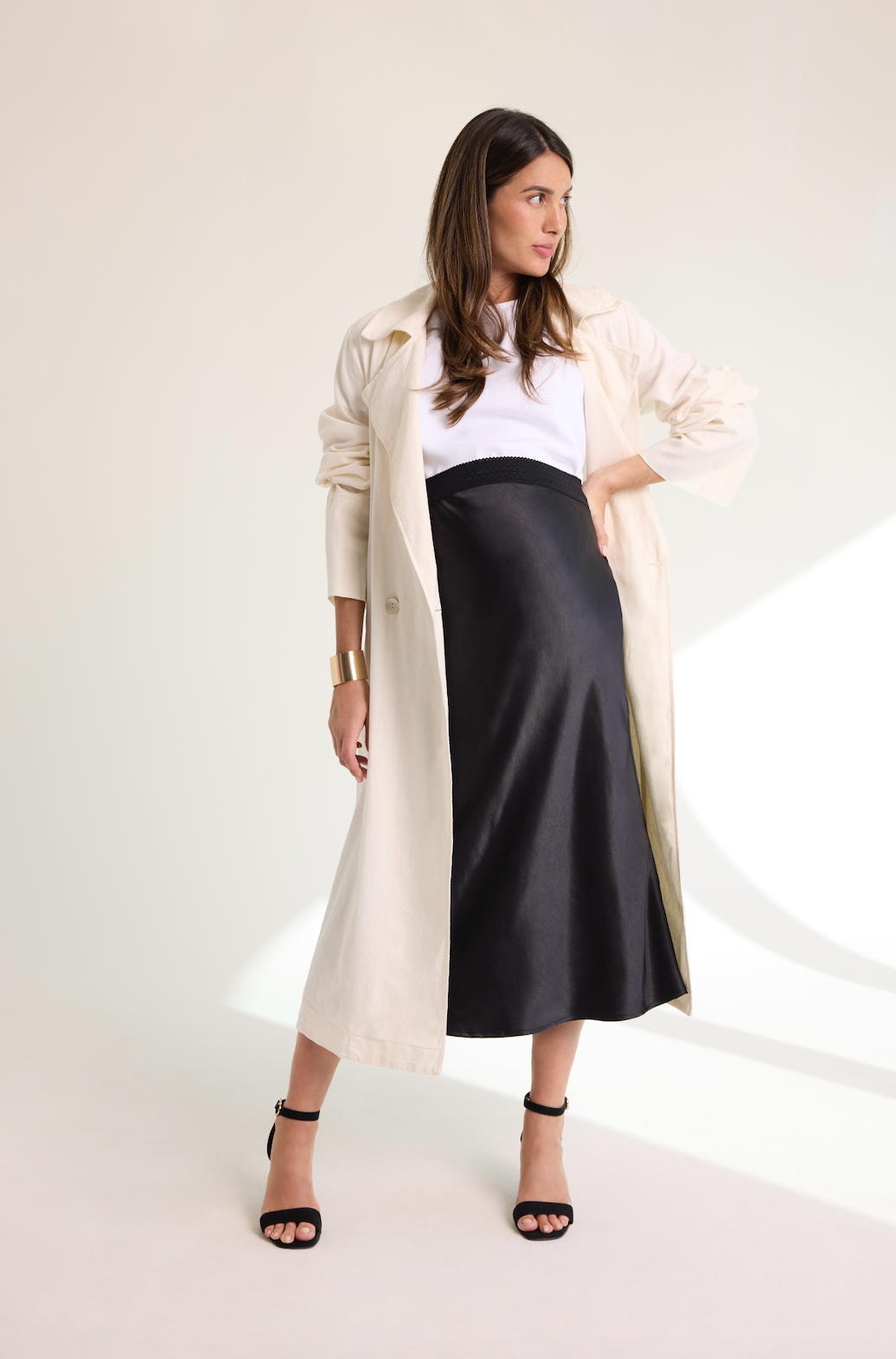مع تغير الفصول، لا تترددي في ارتداء طبقات متعددة. معطف ترنش كريمي اللون فوق تنورة ساتان سوداء وبلوزة ضيقة، يُضفي لمسةً أنيقةً على إطلالتكِ في الأيام الباردة. هذا التصميم العصري الأنيق، كما تُقدمه TMP، يُضفي بساطةً لافتةً، وهو مثالي للمناسبات النهارية والمسائية.