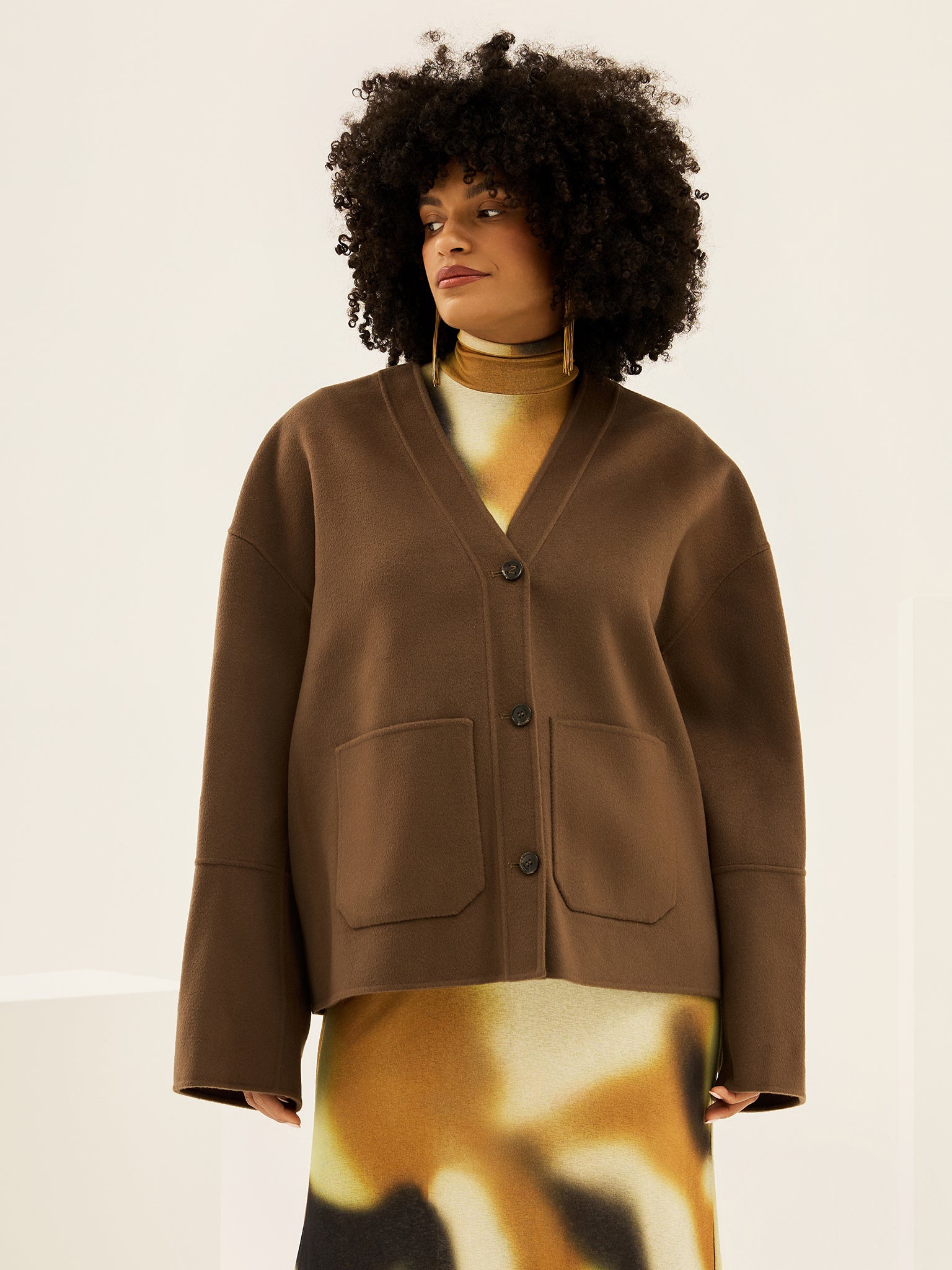 سواء تم تنسيقه مع فستانك الملائم المفضل أو مجموعة مفضلة، فإن هذا الكارديجان الهجين مع الجاكيت باللون البني الكلاسيكي هو إضافة خالدة لأي خزانة ملابس.