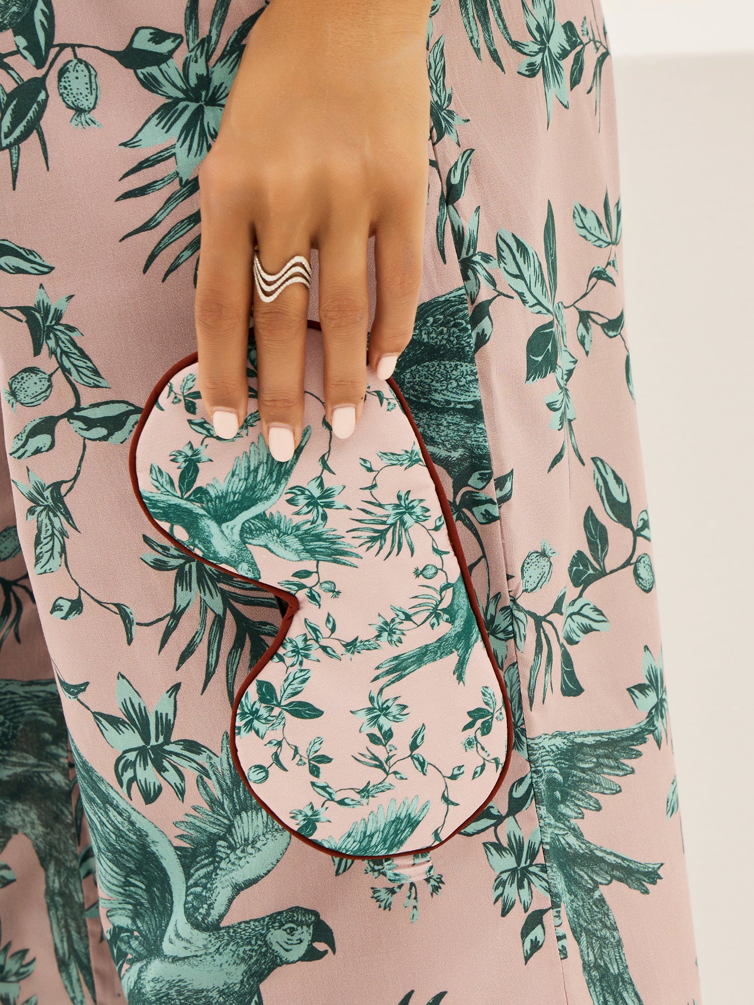 دلل عينيك براحة لا مثيل لها مع قناع العين الأنيق والمريح هذا بطبعة الببغاء الوردي والأخضر، والمصمم لمساعدتك على الاستمتاع باللحظات المريحة التي تستحقها.