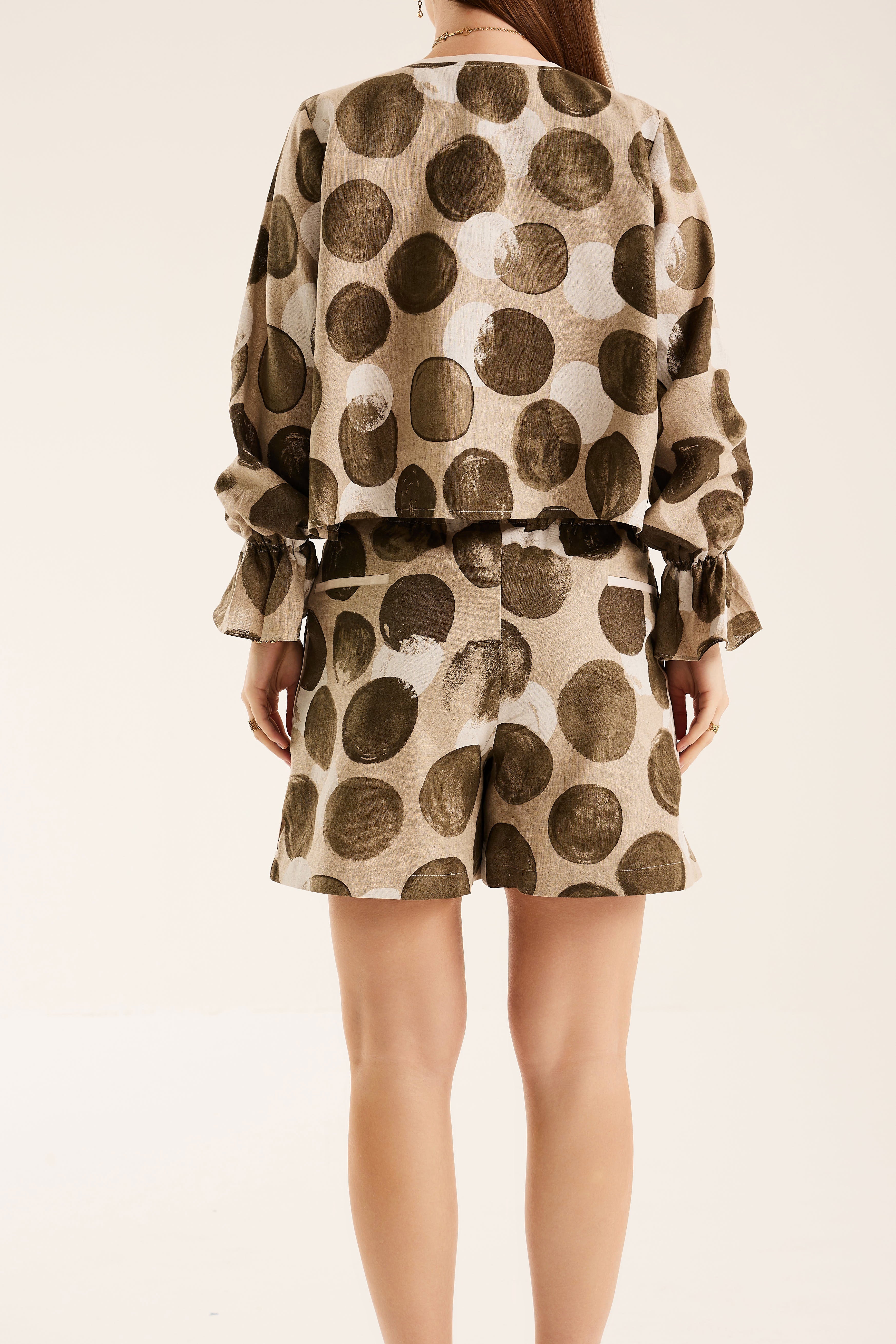 High-waisted shorts. Elasticated waist at the back. Lightweight, non-stretchy fabric. Fits true to size however one size bigger could work for those between sizes. Our model is 7 months pregnant and is wearing a size M (her pre-pregnancy size is S).