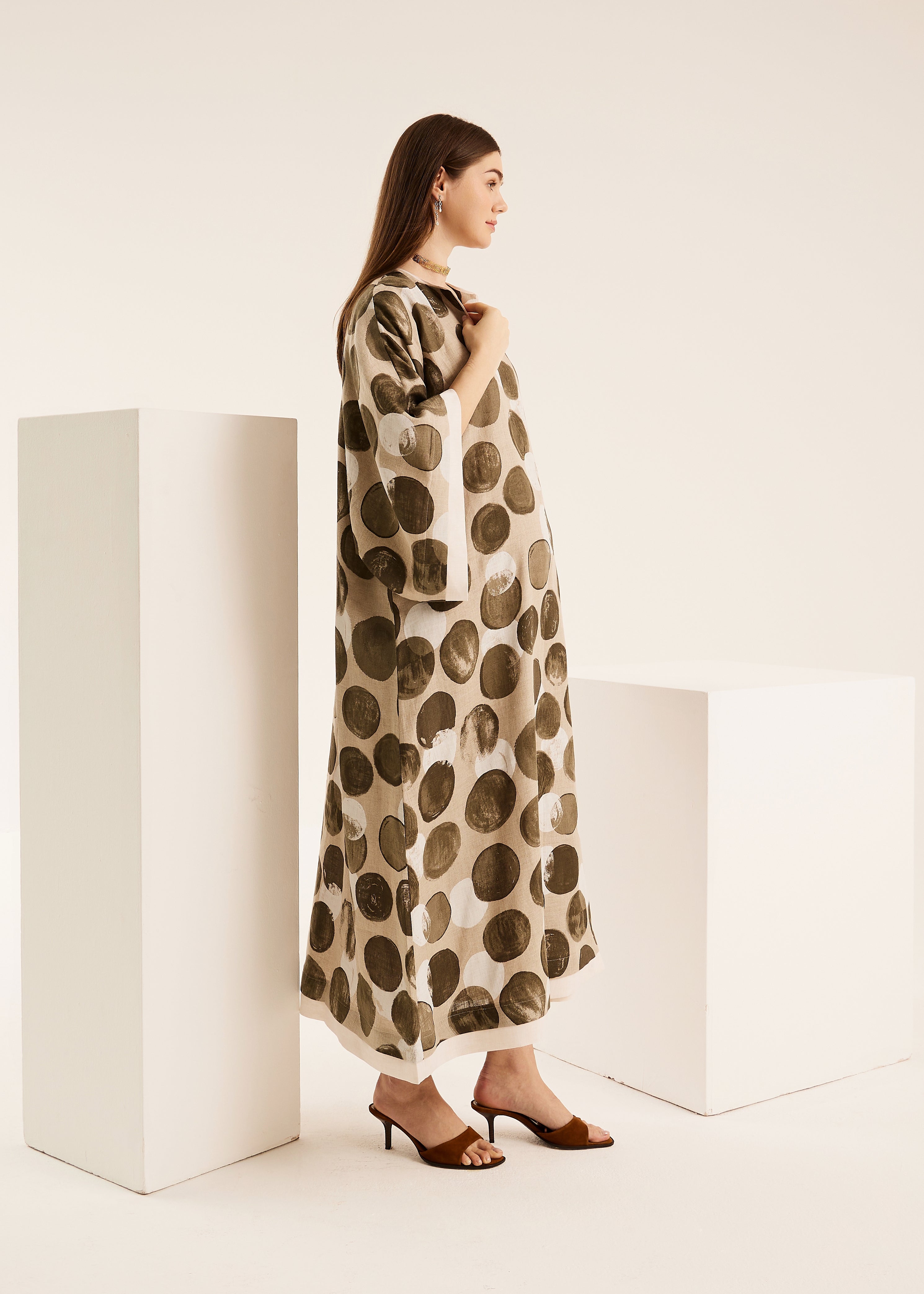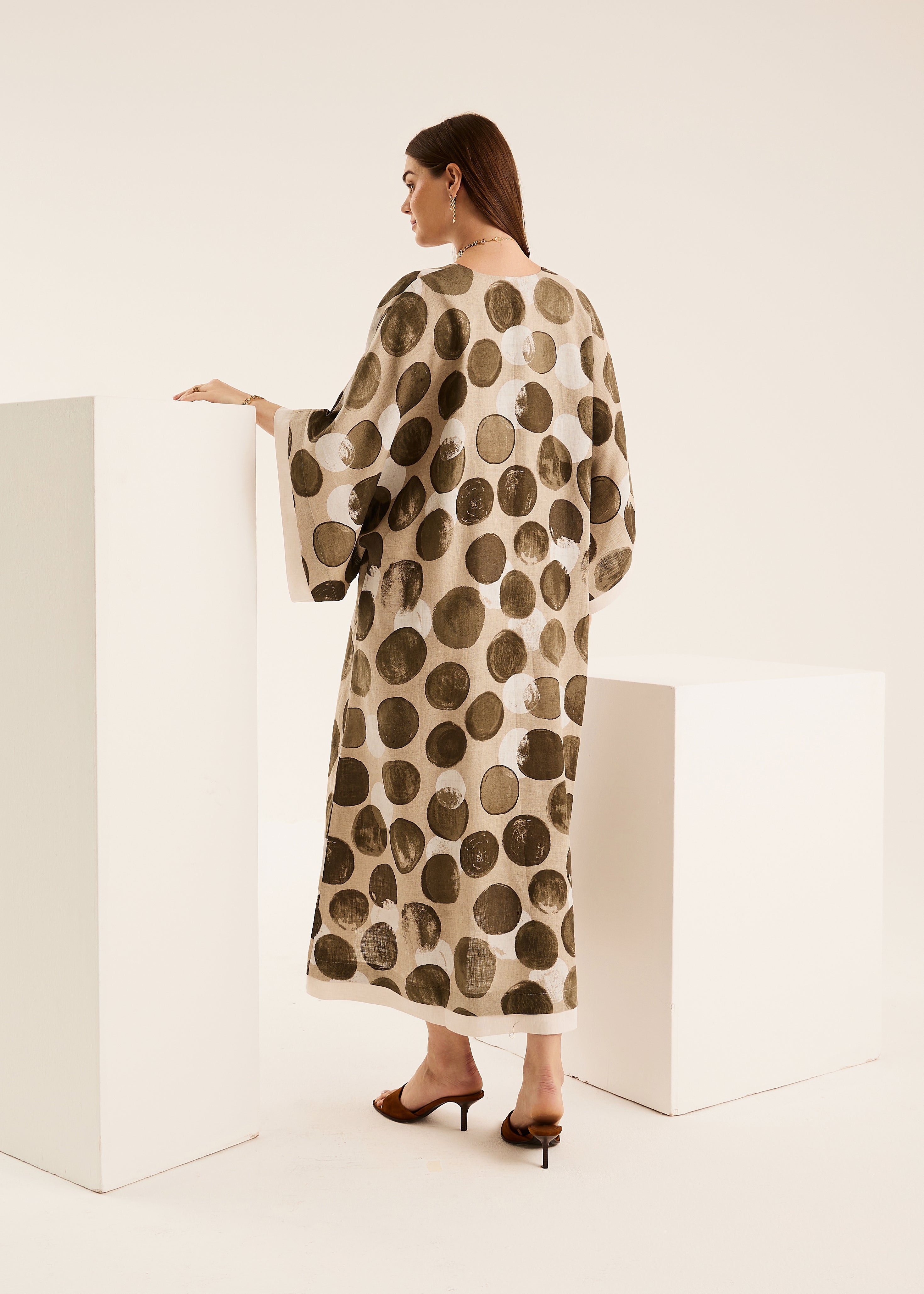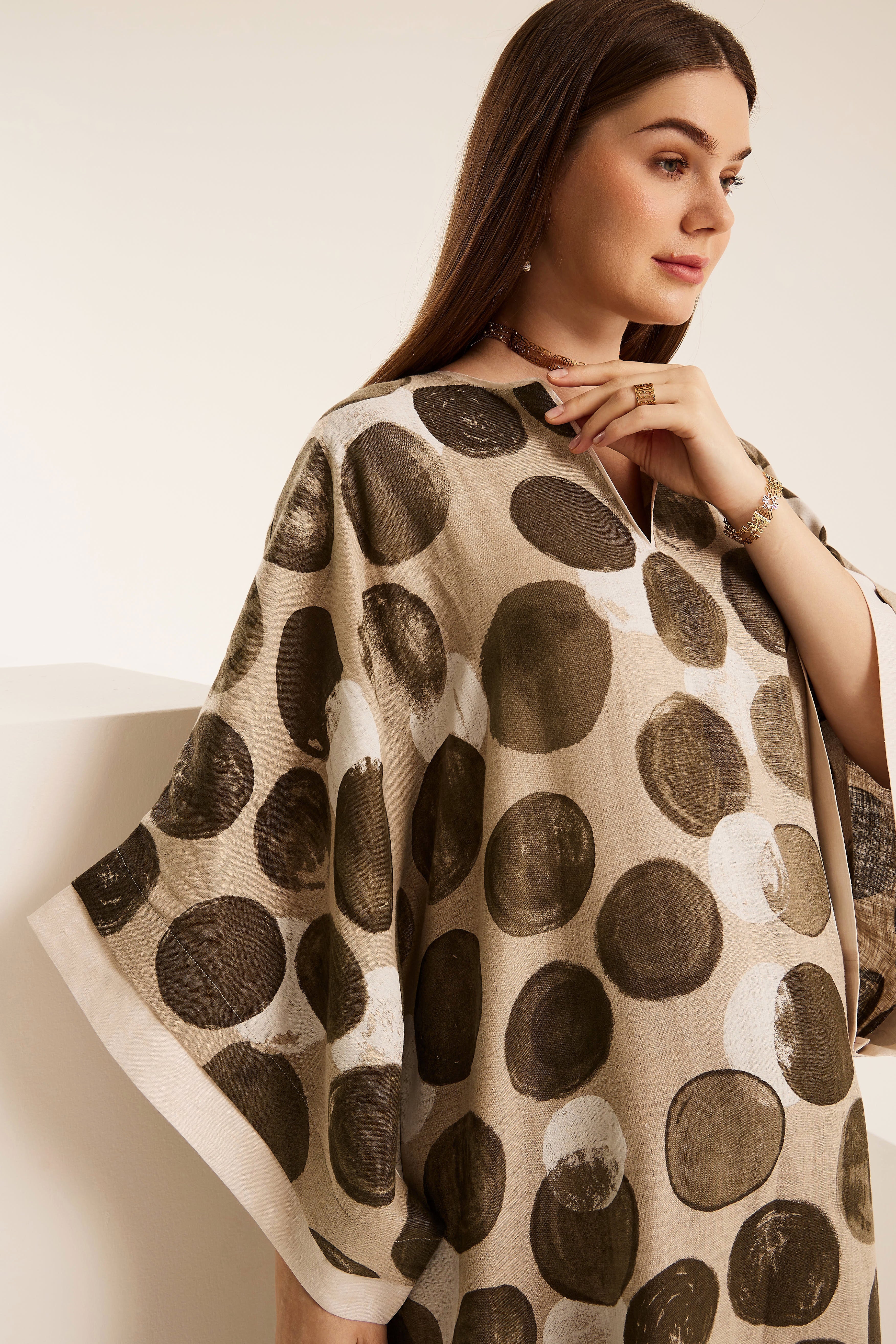 The Khadeeja dress, with its unique kaftan silhouette and striking print, offers effortless versatility. Simply shift your styling to dress it up or down, creating an understated yet beautifully chic look for any occasion.