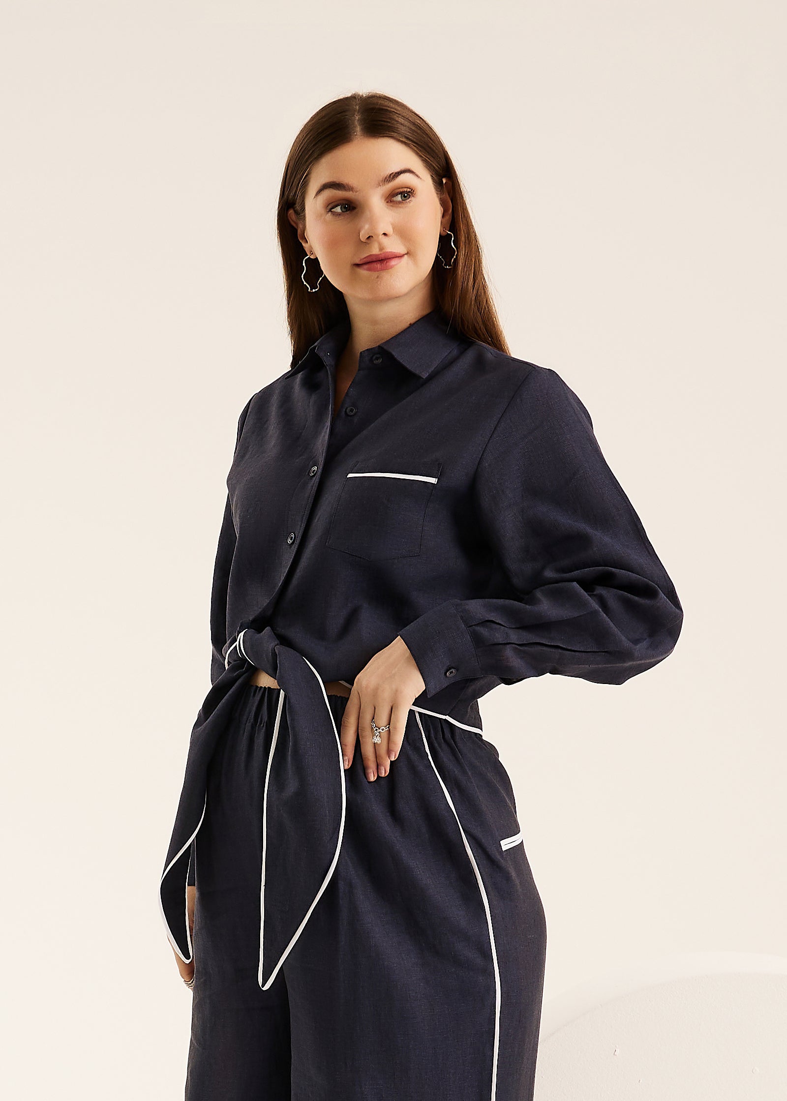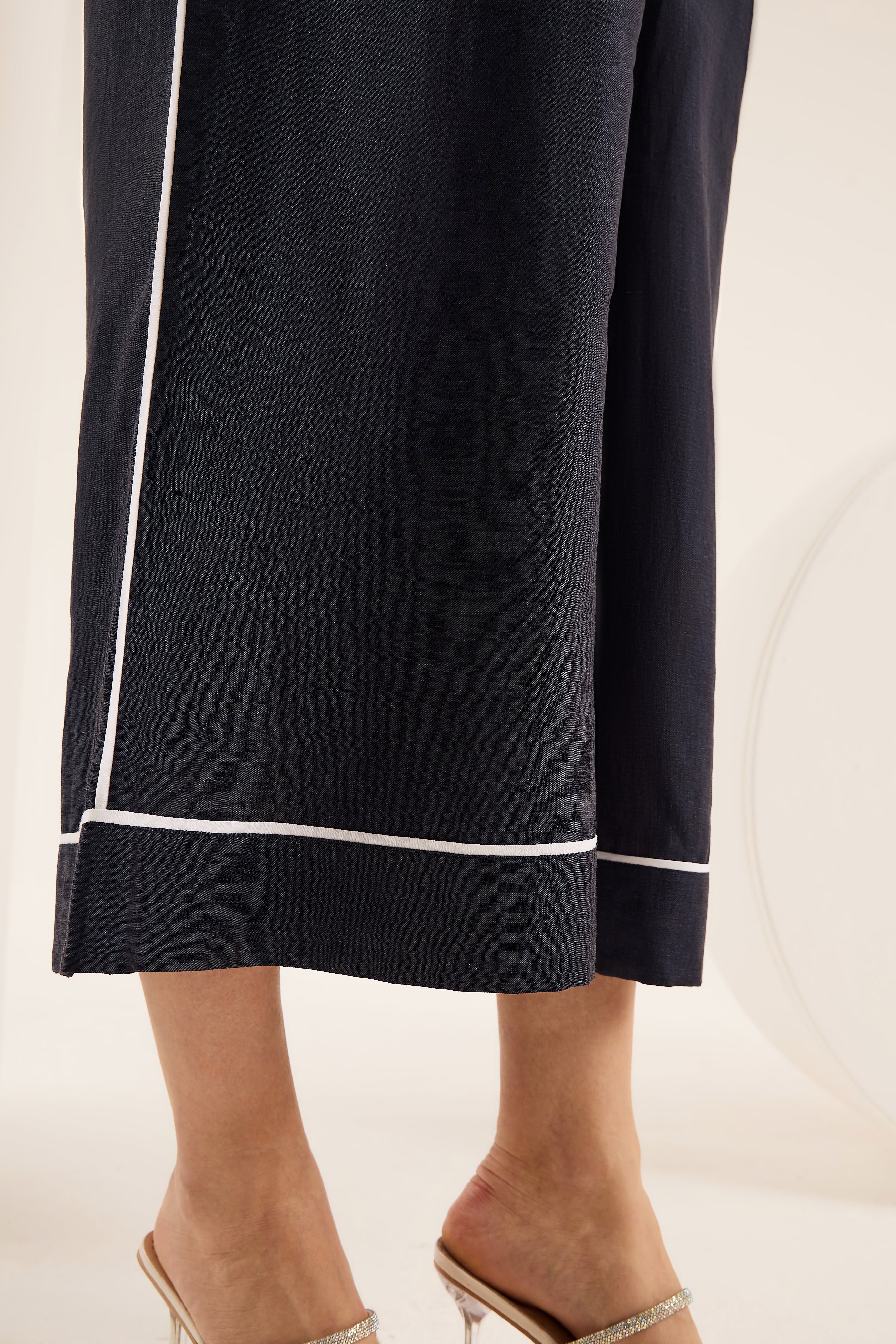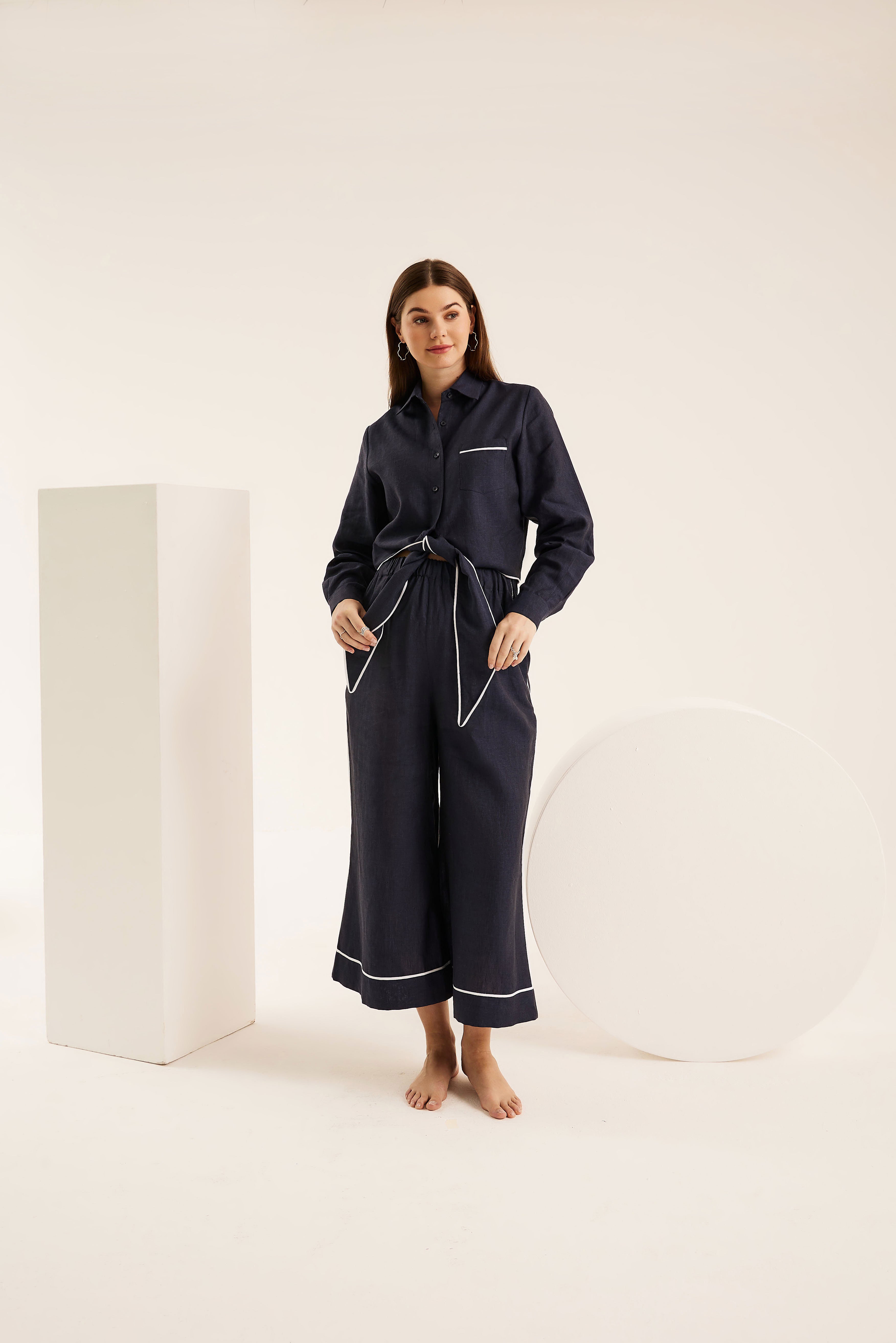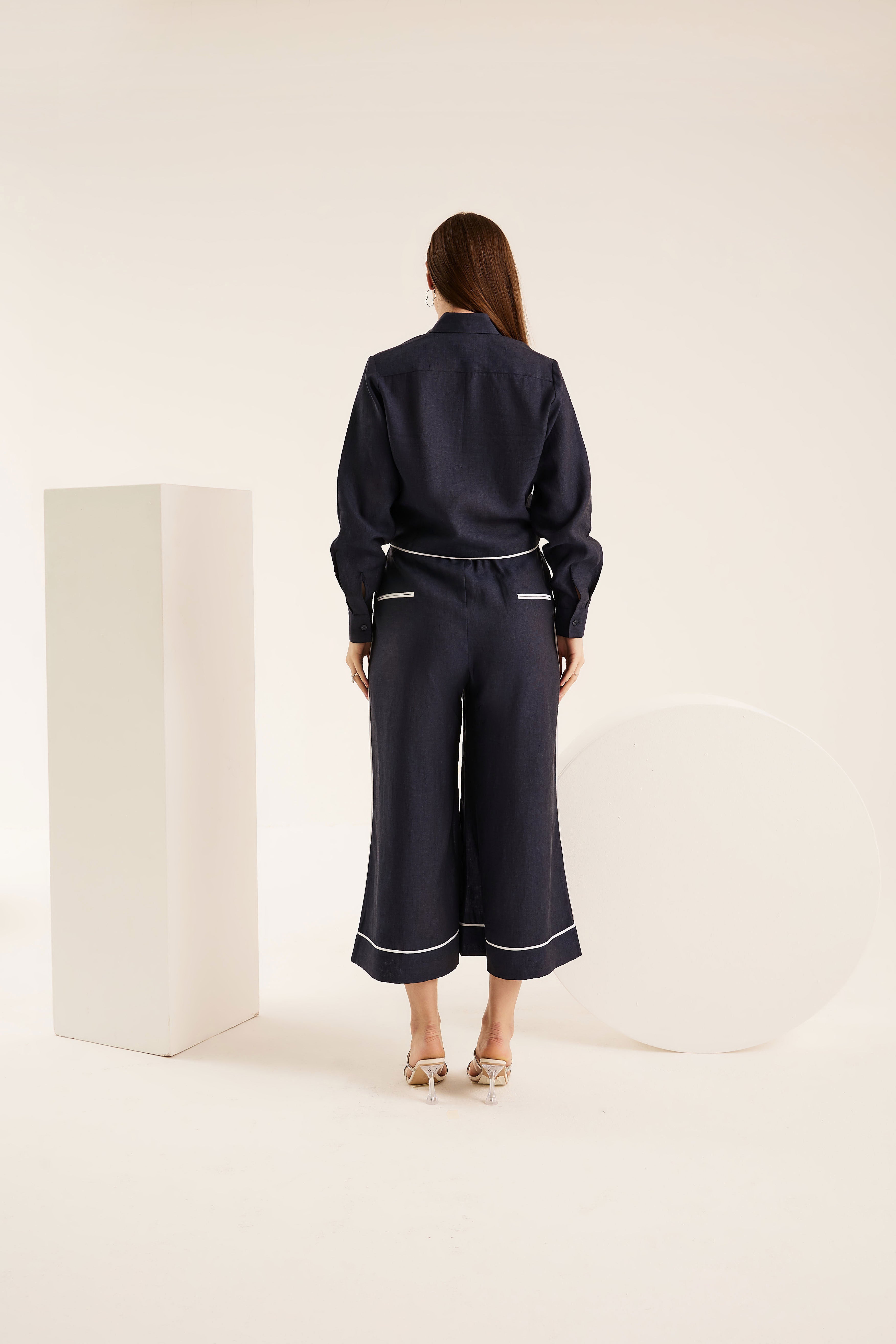 The Polly Pants by KAGE, in an elegant denim blue shade with frost white piping, bring a touch of tailored sophistication to an effortless cropped silhouette, perfect for polished yet relaxed dressing.
