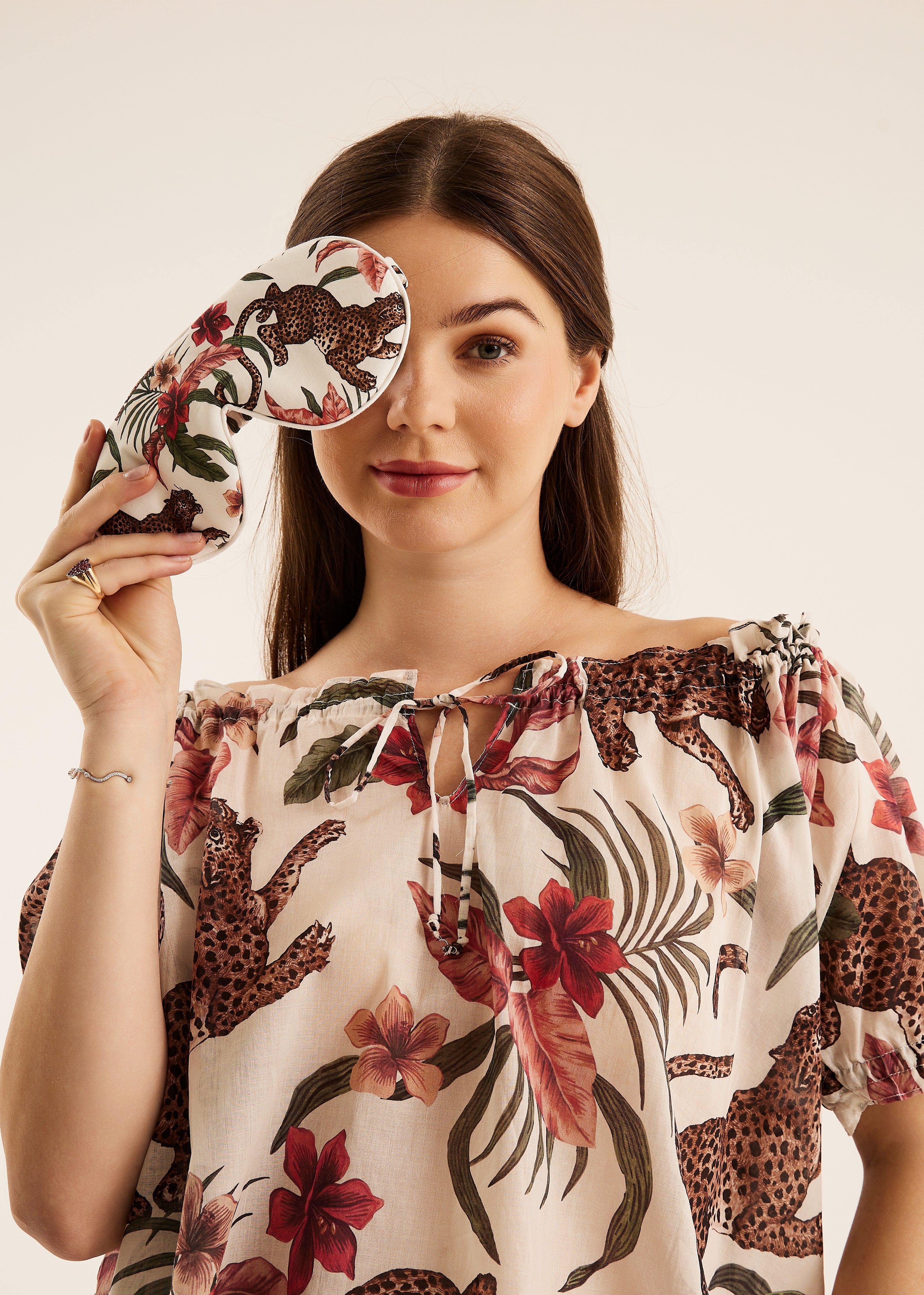 Treat your eyes to unparalleled comfort with this chic and cozy eye mask in the cream Soleia print, designed to help you enjoy the restful moments you deserve.