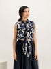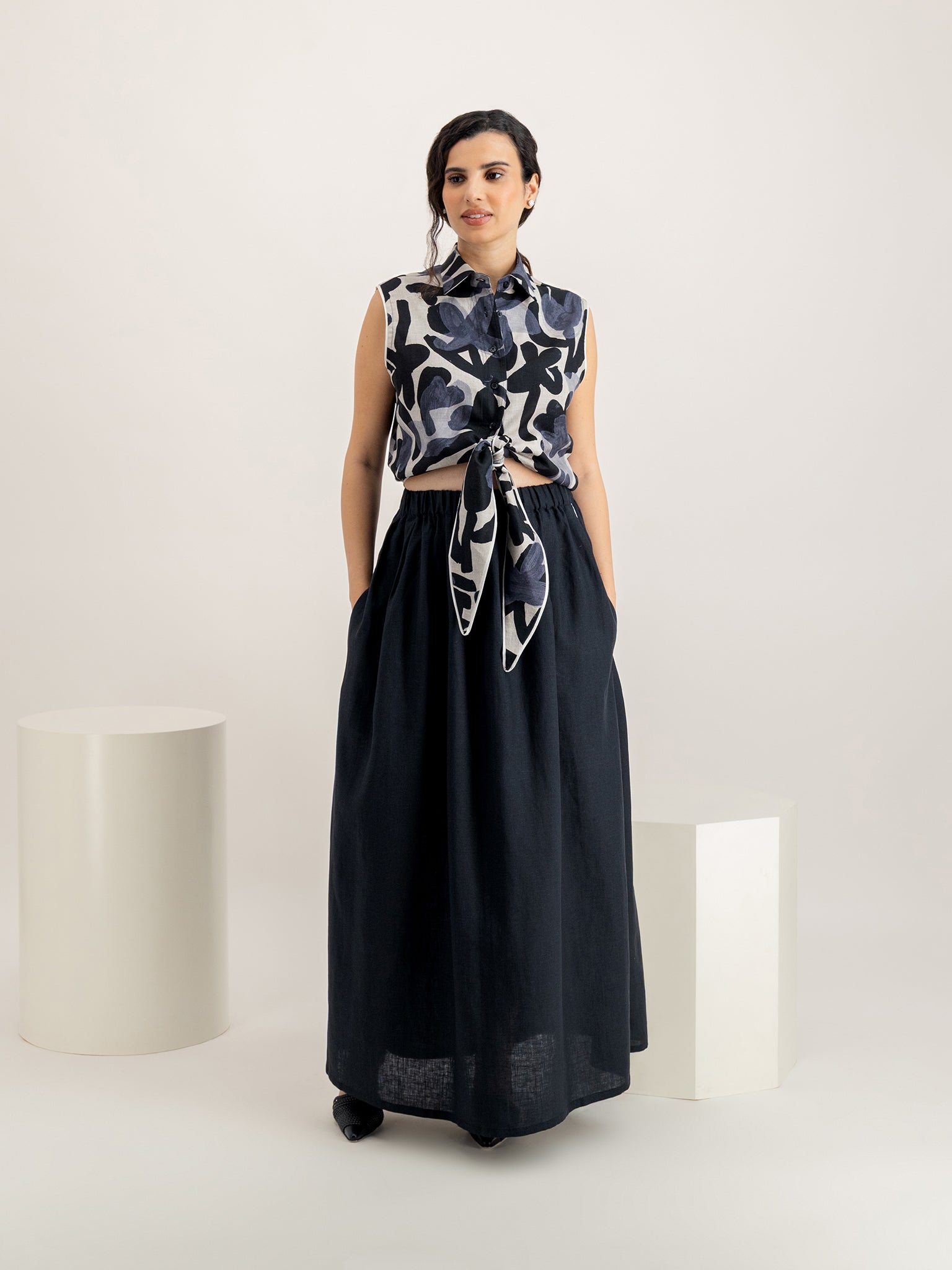 The Astrid top by KAGE is another standout staple in this collection, featuring a seasonal tie-up cropped detail at the front. In its unique print with subtle piping accents, it blends structured tailoring with soft femininity, making it an effortless addition to your summer wardrobe. Pair it with the Tamira pants for a coordinated look, or style it with the Nina skirt, as we’ve done on the model, for a softer aesthetic.