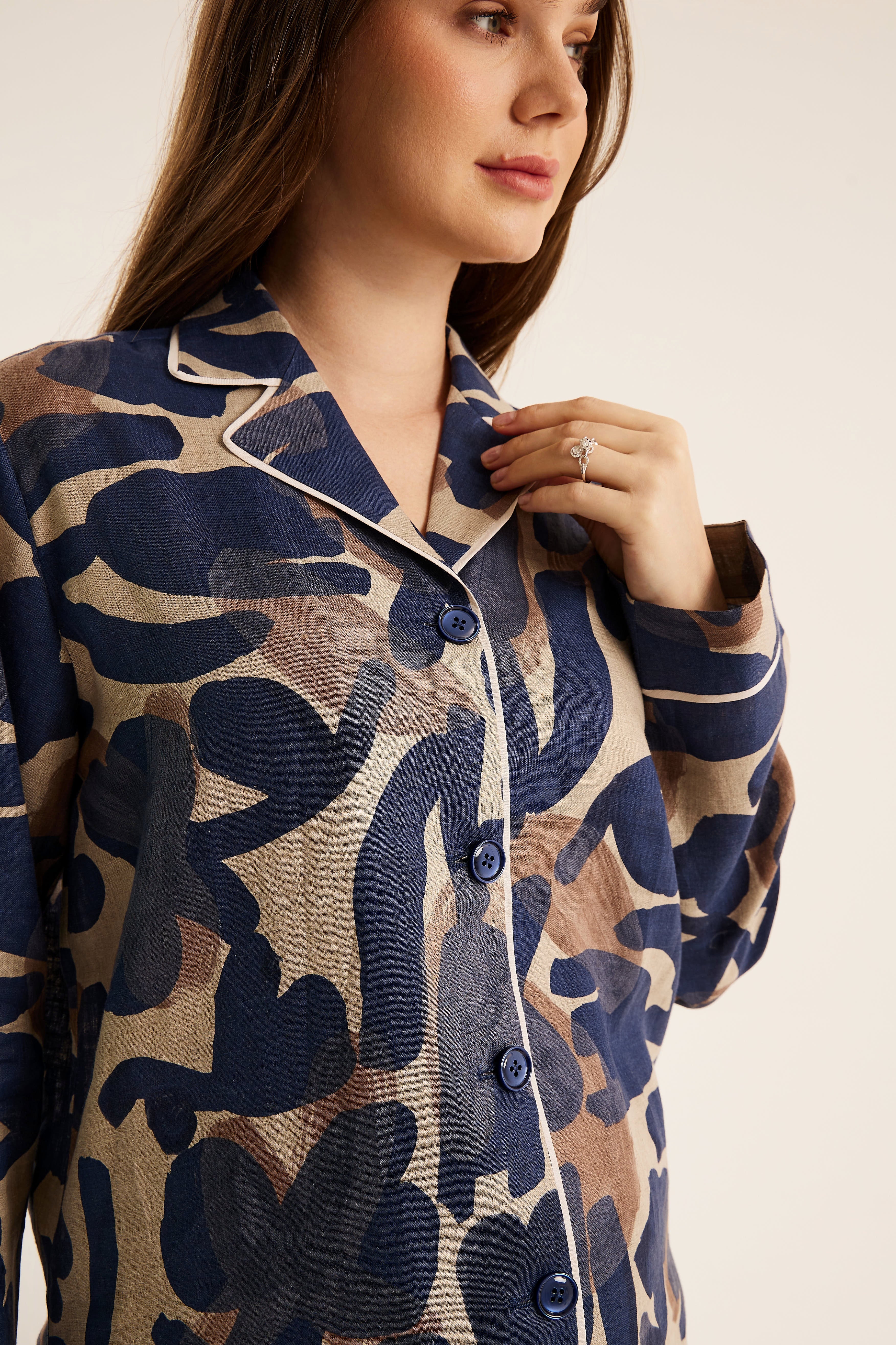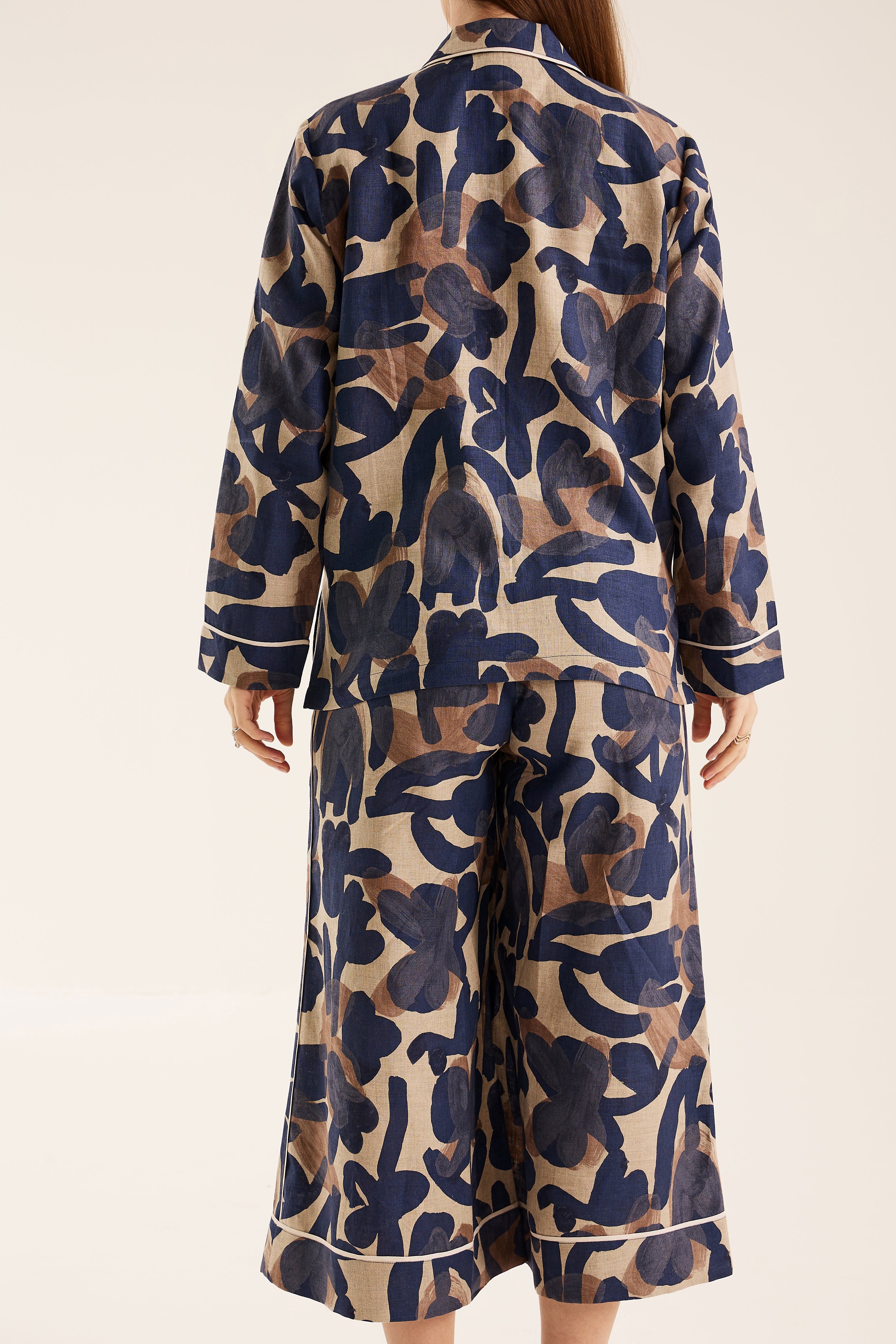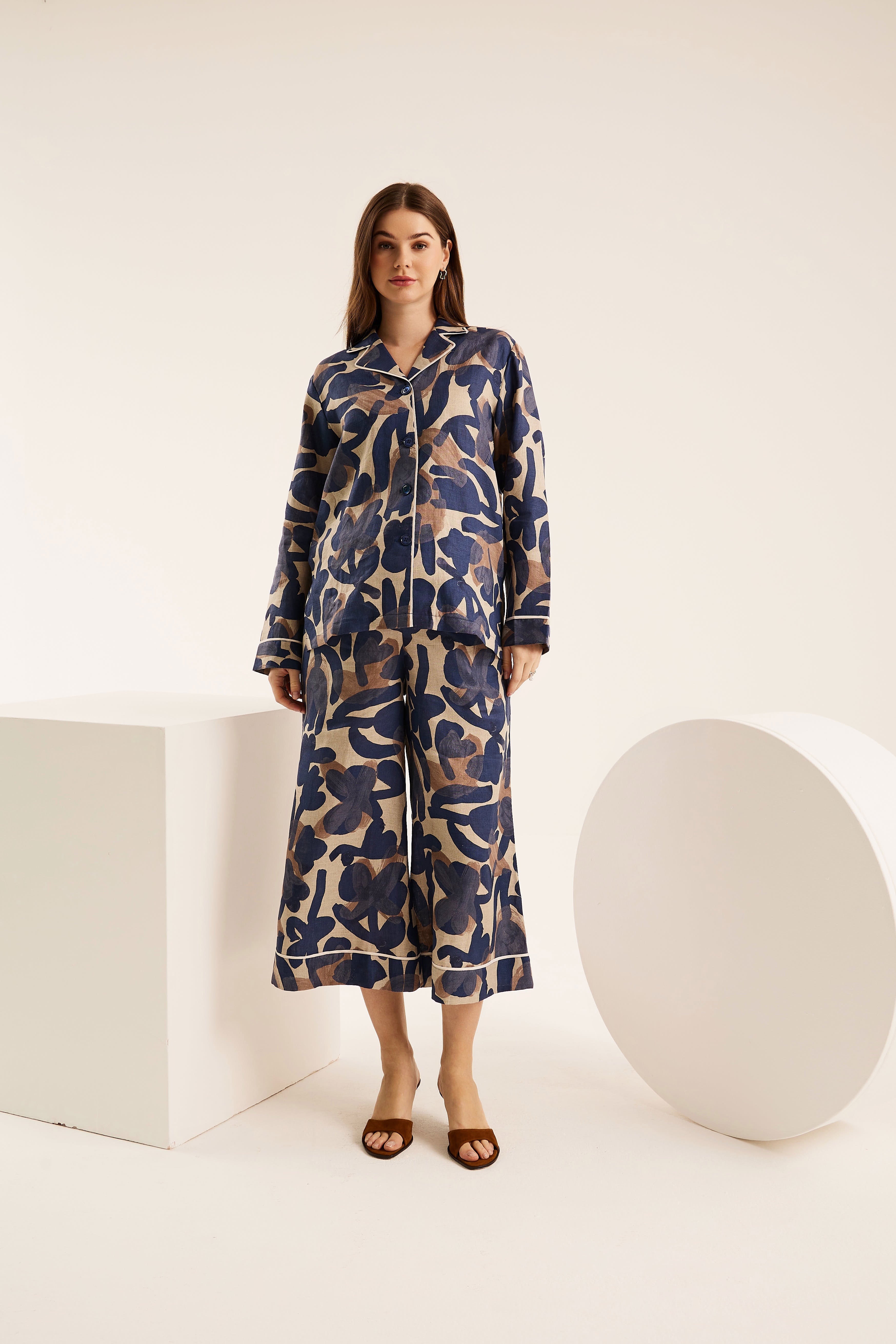 The Miranda top by KAGE, in its beautiful blue and sand beige print, elevates everyday simplicity with effortless elegance. Pair it with the Rebecca pants for a refined, coordinated look.